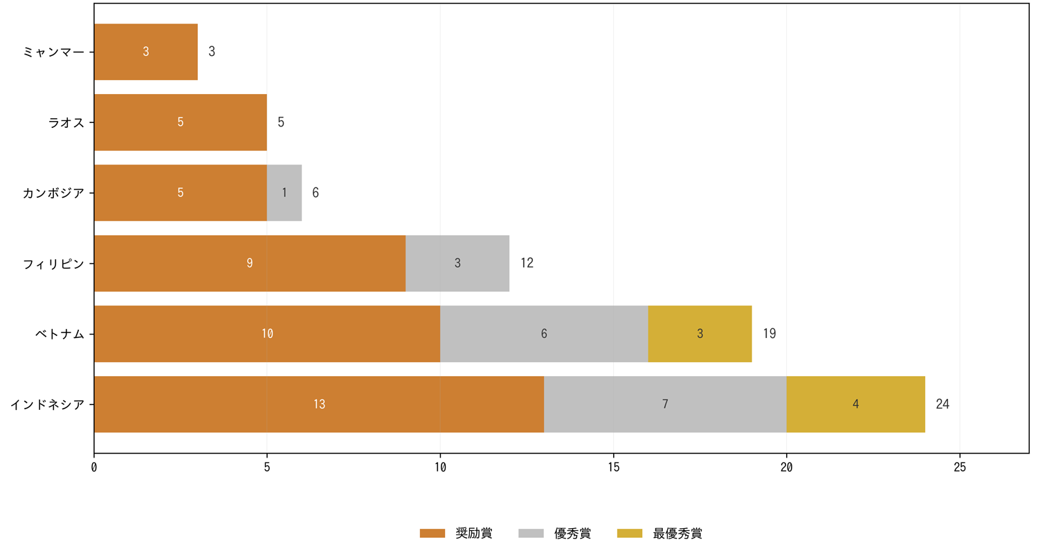 2020〜2024年度の5年間で、対象6か国・募集先41機関を範囲として実施し、計69件の表彰を行いました。(最優秀賞7件、優秀賞18件、奨励賞44件)。年度別の表彰件数は12〜16件の範囲で推移しており、年ごとの変動は限定的でした。国別分布では、受賞者数はインドネシアが最多で、次いでベトナム、フィリピンが続きます。最優秀賞はインドネシアとベトナムに集中しています(図表1・2)。