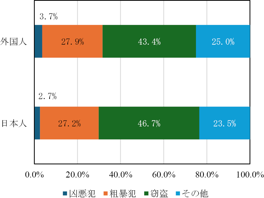 まず,刑法犯における内訳(凶悪犯,粗暴犯,窃盗犯,それ以外)を見ると,日本人と外国人の間に大きな違いはない(図1)。日本人,外国人ともに窃盗がそれぞれ46.7%,43.4%と多く,粗暴犯が27.2%,27.9%,その他が23.5%,25.0%とそれに続く。凶悪犯は2.7%,3.7%とわずかである。なお,先述したように警察白書によれば,外国人犯罪の特徴として共犯(組織的犯罪)の割合が高いことが指摘されており,その割合は刑法犯全体で外国人,日本人がそれぞれ38.7%,12.9%であるとされる2。