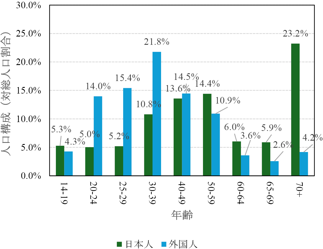 これらを見ると,外国人の犯罪率が日本人よりも高いように見えるが,犯罪の発生率は日本人の間でも年齢によって大きく異なっており,特に20代で高い傾向が見られる(図3)。外国人の人口構成は日本人よりも20-30代の若年層に集中しているため,総人口に対する比率を見るだけではこういった年齢構造を反映した犯罪率の違いを見ることができない(図4)。