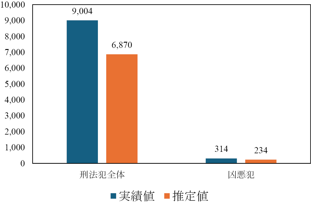 また,凶悪犯について見ると,2015年の犯罪率に従った場合には,実績値は推定値の1.6倍と2023年の結果よりも高くなったものの,2005年の値を用いた場合には同比率は1.1倍と2023年の1.3倍よりも低下した。