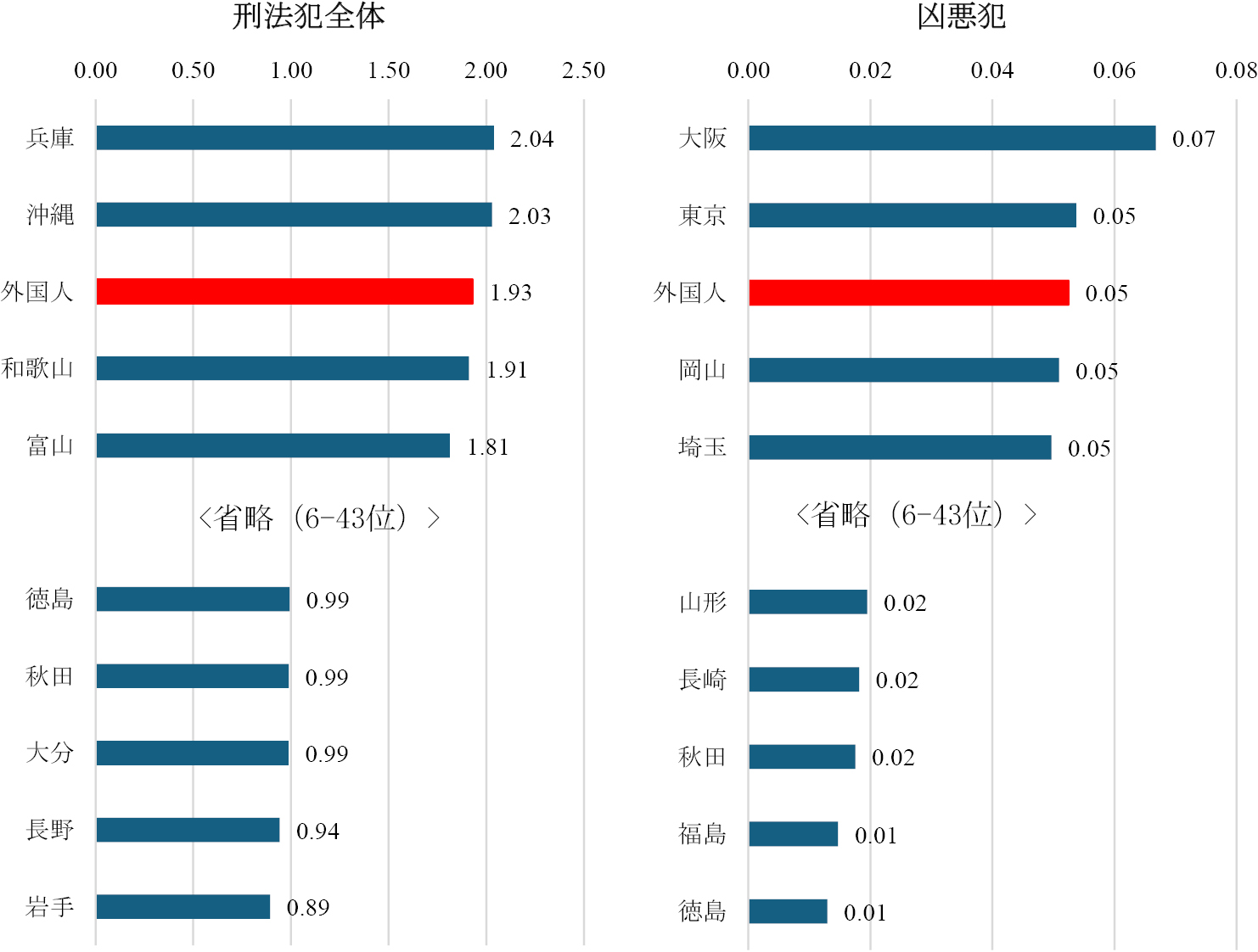 外国人の犯罪率はもっとも高い兵庫県よりも低く,和歌山県の1.91人/千人にほぼ等しい。凶悪犯について見ると,大阪府や東京都よりも低く,岡山県とほぼ同程度である。