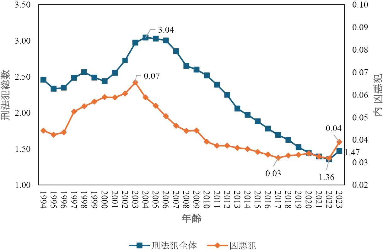 日本人の犯罪率の推移を交通業過除く刑法犯全体とその内の凶悪犯に分けて見ていこう(図7)。その結果,日本人の犯罪率は2004年に3.04人/千人とピークを付けたあと,次第に低下し,2022には1.36人/千人と底を打ち,2023年には1.47人/千人となっている。凶悪犯について見ると,2003年に0.07人/千人とピークを付けたあと,刑法犯全体と同様に緩やかに低下し,2022年に0.03人/千人と底を打った後,2023年には0.04人/千人となっている。