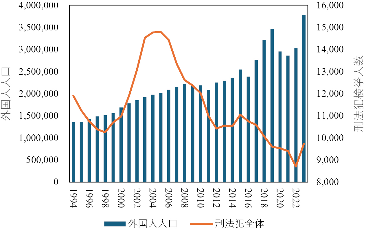 日本人の犯罪と異なり,外国人の犯罪について見ていく際に留意すべき点は,その発生メカニズムの違いである。例えば,「警察白書」(国家公安委員会・警察庁 2024)においては,外国人犯罪を論じるにあたり,永住者等,日本への定住性が強い人たちではなく,短期滞在など一時的に日本に滞在する「来日外国人」に焦点を絞っている。またその際,そもそも犯罪を目的として来日するプロの組織犯罪の一つとして扱っており,一般的な旅行客や定住外国人とは明確に区別している。