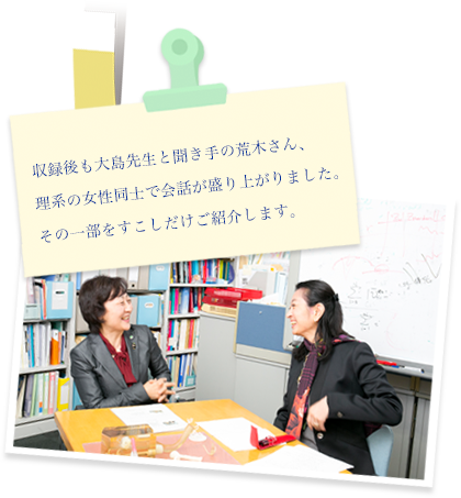 大島: このような違いを乗り越えて、これからは世界の人たちと一緒に仕事をしないといけないのでしょうね。研究のスタイルや会社もそうですよね。私が大学院の学生だった頃って、本当に日本人ばっかりで、女性がたまたま私一人という状態でした、しかも、皆同じ年代の20代前半から半ばの日本人男性、同質な環境だと、新しいアイデアはなかなか生まれにくいのではないかと思います。“気付き”につながるきっかけが少し欠ける感じがします。ですから、ジェンダーや国籍も含めてさまざまなバックグラウンドの方がいろいろな形で交流し合うことは、非常に大事だと思います。