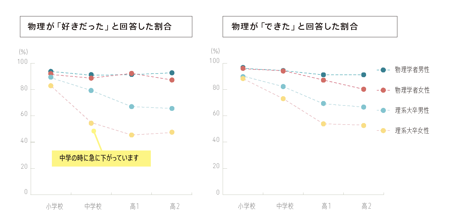 中学です。女子生徒たちが、理数系の苦手意識をもつのは、中学の早い時期からだと言われています。同時に、文理選択が高校1年生の秋に迫ってくるので、将来の大まかな進路(文系か理系か)を決めなくてはなりません。そうなると、医師や薬剤師、看護師などの医療系や、司法書士、弁護士、会計士など資格のある職業など、目に入った職業を念頭に置きながら将来の道を決めざるを得ません。そのなかで、特に女子学生は親の影響もあり「安心してめざせる道を行かせたい、行きたい」という思考のなかで職業選択をしがちです。