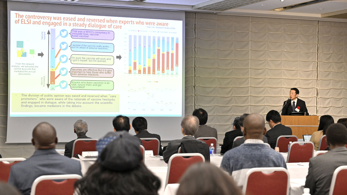 当日は、会場53名、オンライン184名、合計237名の方にご参加いただき、本基金の助成を受けた5件の研究プロジェクト代表者が、2021年12月から3年間にわたり行われた研究の成果を発表しました。参加者からは、それぞれの研究が異なるアプローチでコロナパンデミックから貴重な知見を得ており、有益な成果を上げている点が印象的だった、今後のさらなる研究活動の進展にも大いに期待したい、などの感想をいただきました。